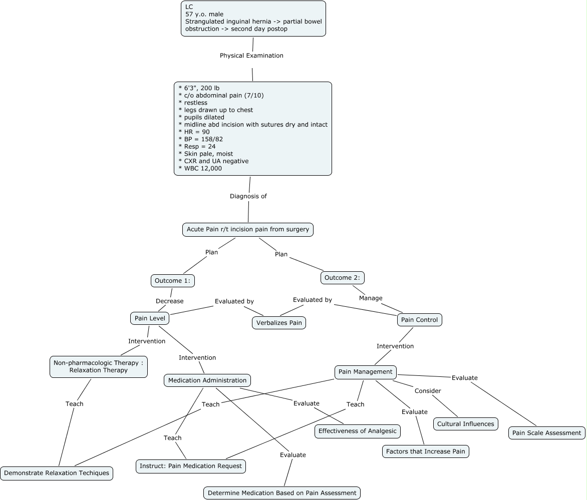 CONCEPT MAP Acute Pain Outcomes partially met: • Verbalizes pain and discomfort Analgesic Administration Simple Relaxation Therapy Pain Management Pain Level aeb mild to no: • Reported pain • Protective body care professional Outcomes partially met: • Requests analgesic 30 ... Access Full Source